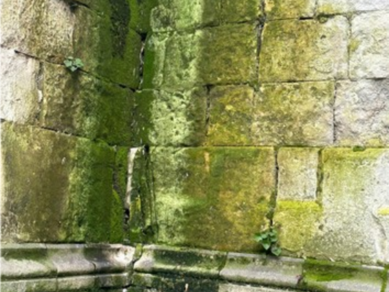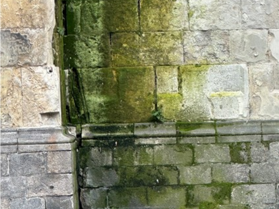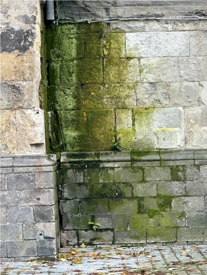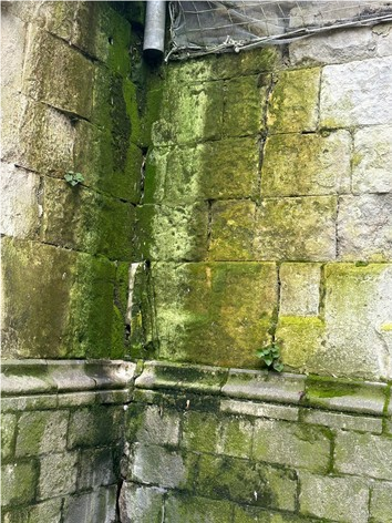 Vous y verrez un verdissement des pierres dues à un ruissellement des eaux pluviales venant sans doute du haut de l’édifice ainsi que de la descente dont il manque un morceau. La mousse abonde sur le bas et quelques fougères commencent à poindre leur nez vers le bas du mur.